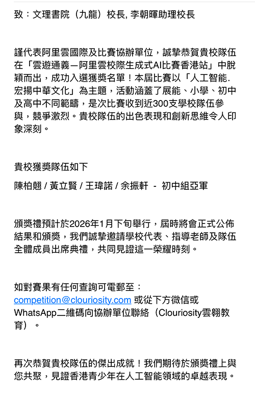 第二屆「雲遊通義」校際生成式 AI 比賽(香港站)初中組亞軍